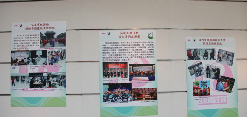 澳門道教協會主辦的「2011道教文化節」之「道教神像及經書展覽」, 十月八日假大炮台迴廊開幕,陳列逾三十幅清代工筆畫及木石版刻畫的道教神像畫,三十多本清代及民初的道教經書,均屬澳門吳慶雲道院珍藏,還展出香港蓬瀛仙館借出的多種語文版本《道德經》,內容豐富,展期至十月十五日。 展覽開幕式8/10下午三時舉行,中聯辦協調部張深居副部長,澳區全國人大代表、立法議員崔世平先生,香港道教聯合會副主席、香港蓬瀛仙館行政總裁梁德華道長,澳門博物館李麗嬌代館長,民政署總余永鴻處長,澳門霍英東基金會史濠總幹事,香港蓬瀛仙館道教文化中心陳敬陽主任,理工學院戴定澄教授,澳門街坊總會黃耀球副理事長,澳門書畫藝術聯誼會李秋平會長,澳門道教協會吳炳鋕會長及葉達副會長共同剪綵。 吳炳鋕會長致開幕詞說,道場中常見道教神像畫,多以工筆書法描繪或木石刻印版,不乏藝術珍品,這次展出的三十多幅部分為清代所作,歷史性及實用性俱備,為吳慶雲道院珍藏。還展出香港蓬瀛仙館難得借出的多種語文版本《道德經》。 同場展示了早前舉辦《道德經》中學生書法比賽獲奬的一百二十多幅其中優秀之作。 澳門道教科儀音樂於○九年被列入澳門非物質文遺名錄,今年六月更成為第三批國家級非物質文化遺產。