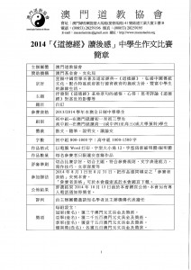 2014年本會繼續舉辦「《道德經》讀後感」中學生作文比賽,分初中組及高中組,參賽者學生須於2014年8月1日至31日期間將參賽者表格及作品遞交本會。