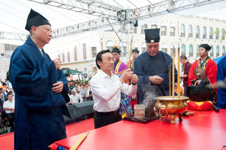 福建省道協法務團主持祈福法會,何厚鏵副主席、譚俊榮司長由吳炳鋕陪同到台上參拜祈福。