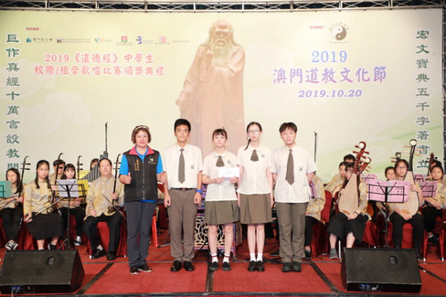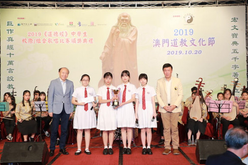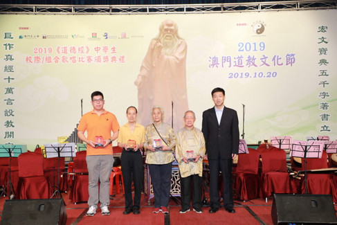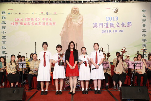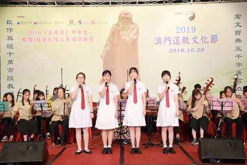 2019《道德經》中學生校際/組合歌唱比賽獲獎隊伍於頒獎禮中演唱,並由澳門道樂團伴奏。 當晚舉行頒發服務獎予本會及澳門道樂團理監事及團員–王忠人、梁文威、詹忠昇、羅志文、張心憮、史松枝、阮榮聰、鄭奕源、鍾美嫻、盧瑞櫻、劉維傑、吳烱章、黃均創、黃安琪、梁恩情及葉卓騫 。