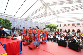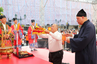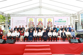 本會於2019年10月19日,下午三時,假議事亭前地,舉行2019澳門道教文化節開幕及祈福典禮。主禮嘉賓:全國政協副主席何厚鏵先生、澳門特別行政區政府社會文化司司長譚俊榮博士、中聯辦張榮順副主任、中聯辦協調部傅鐵生部長、中央統戰部薛樹琪副局長、廣東省民族宗教事務委員會曾曉暉副主任、廣州市民族宗教事務局汪茂鑄局長、中國道教協會副會長兼秘書長張鳳林道長、澳門立法會梁安琪議員、旅遊局程衛東代局長、文化局梁惠敏副局長、澳門基金會委員黎振強先生、教育暨青年局黃健武代副局長、市政署代表高佩珊部長、香港道教聯合會主席、香港蓬瀛仙舘理事長梁德華道長、香港圓玄學院主席陳國超道長、萄葡牙道教協會José Barreno道長、新加坡道教總會會長陳添來道長、馬來西亞道教總會會長陳和章道長、泰國道教總會王馨會長、廣東省道教協會副會長、廣州市道教協會會長潘志賢道長、香港蓬瀛仙舘副理事長歐振成道長、江西省上饒市道教協會副會長黃大樸道長、台北指南宮主任委員高超文先生、台北松山慈惠堂總策劃長李瑞彬先生、馬來西亞北海斗母宮署理主席洪林堅先生、台北新北市五股賀聖宮王玉妹會長、韓國道教本山壽星宮會長李金鸞道長、台灣桃園縣中壢仁海宫王介禧副董事長、澳門天主教教區主教代表蔡文威先生、河南省南陽市道教協會李泰丞會長、遼寧省鳳城市鳳凰山紫陽觀監院石興道道長、福建安溪道教協會李育源會長、新會紫雲觀代元波道長、西安城隍廟張昭先生、世界大伯公節代表李運平先生、台中南投受天宮主委許瑞斌先生、北港朝天宫蔡咏鍀董事長、台灣高雄內門順賢宫黃文正董事長及台灣高雄道德院國際事務部主任陳淵湶先生等主禮。香港、台灣、萄葡牙、韓國、新加坡、馬來西亞、泰國、江西、遼寧、河南、西安、福建及廣東等地道教團體領導,共約四百多人出席。