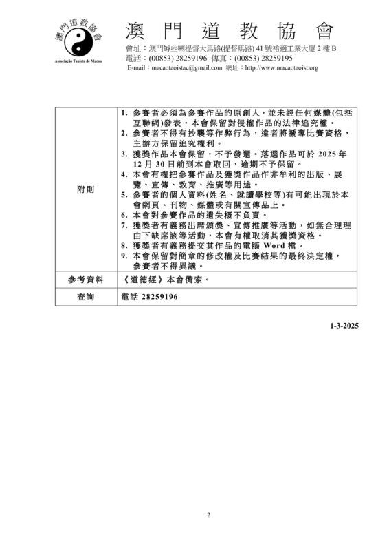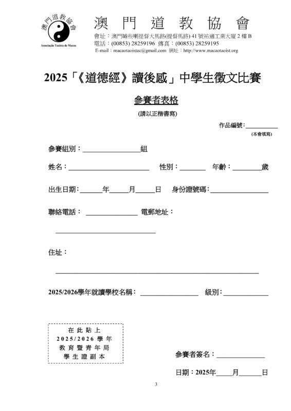 為讓中學生認識我國文化瑰寶《道德經》,弘揚中國傳統文化,配合特區政府推行德育教育的施政方針,本會自2011年舉辦《道德經》中學生書法比賽、「《道德經》讀後感」中學生徵文比賽及校際歌唱比賽,深獲社會人士、學校師生、傳媒的讚許,對本地區學生的德育發展起着積極的推動作用,2025年本會繼續舉辦中學生徵文比賽(章程見附件)。參加者於2025年9月1日至9月21日期間將參賽者表格(見附件)及作品遞交本會。
