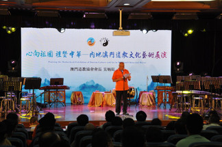 澳門道樂團、澳門少年八音鑼鼓團為觀眾呈獻澳門國家級非物質文化遺產—澳門道教科儀音樂之《澄清韻》、《太乙讚》、《禮斗組曲》和澳門八音鑼鼓《朝臣大戰》、《喜慶歡騰》等八個曲目,精彩的表演贏得全場觀眾熱烈掌聲。此次進京交流,澳門道教表演團隊付出了很大努力,在七月酷熱的北京揮灑汗水,讓二百多年傳承的非遺文化和 “道教科儀音樂”這朵文明之花在首都展示。其後北京辰園演藝團隊展演《辰園四雅圖》、《武當太極》、《醉拳》和道曲《道情》等九首曲目。最後全場齊唱的《我和我的祖國》,把現場氣氛推到高潮後,圓滿陲幕。中國道教協會李光富會長設宴招待參訪團稱道教文化有着悠久的歷史和深厚的內涵,是中華文明的重要組成部分。道教音樂是道教文化的表現載體,既表達了道教哲理教義,傳遞出了千年東方的美學思想,形成了自己鮮明的藝術特色,喜見眾多青少年隨團交流傳承道教文化,實可喜可賀。