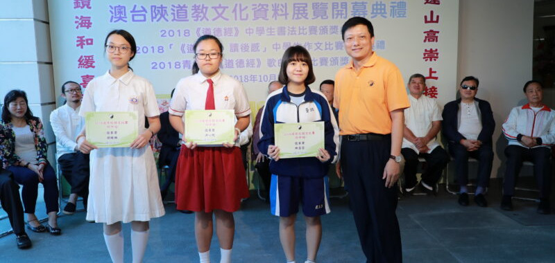 由本會主辦的“二○一八澳門道教文化節”系列活動“澳台陝道教文化資料展覽開幕典禮”,以及“二○一八《道德經》中學生書法比賽、作文比賽、歌曲創作比賽頒獎典禮”,中聯辦協調部副部長盛剛、全國人大代表劉藝良、澳門基金會行政委員黎振強、澳門管理學院院長鄭慶雲、教青局代表黃超然、道教協會會長吳炳鋕、台北顯妙壇道長朱建成、中央美術學院版畫系碩士解丁泉、陝西省教育書法研究會會長陳雲龍、議員梁安琪代表林淑源、濠江中學校長尤端陽、澳門書畫藝術聯誼會會長李秋平、同善堂中學代校長黃德進等主禮,並為獲獎學生頒獎。