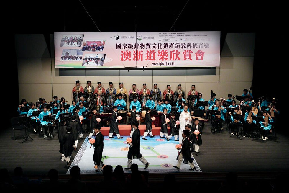 由澳門道教協會、澳門道樂團主辦,浙江省舟山市蓬萊仙樂樂團、澳門道教青年協會協辦的“國家級非物質文化遺產道教科儀音樂澳浙道樂欣賞會”,於2025年6月15日,2:45PM,假文化中心小劇院舉行。是次欣賞會旨在推廣國家級非物質文化遺產澳門道教科儀音樂、澳門非物質文化遺產清單中八音鑼鼓,和加強與內地道樂團交流。