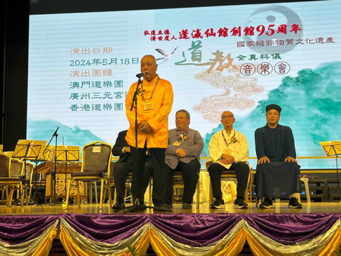 為慶祝香港蓬瀛仙館創館九十五周年,邀請澳門道樂團聯同 澳門道教協會法務團於5月18日赴香港尖沙咀會堂,參加國家級非物質文化遺產道教全真科儀音樂會。是次道樂欣賞會澳門道樂團由會長吳炳鋕率七拾多人參加外,主辦方還邀請廣州三元宮道樂團和香港道樂團聯同展演。主禮嘉賓包括何志平博士、吳炳鋕會長、廣州三元宮主持陳和曉及蓬瀛仙館理事長林赤有,並吸引大批道樂愛好者出席,全場滿座。