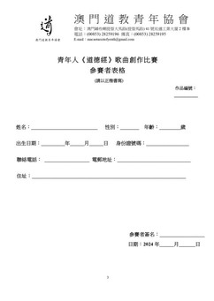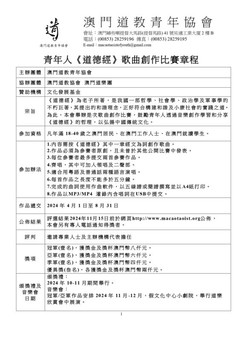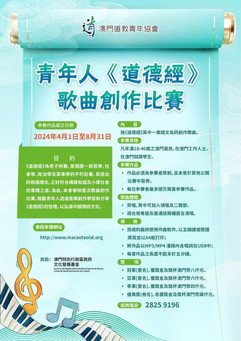 青年人《道德經》歌曲創作比賽章程 (一) 目的:《道德經》為老子所著,是我國一部哲學、社會學、政治學及軍事學的不朽巨著,其提出的和諧理念,正好符合構建和諧及小康社會的實踐之道。為此,本會舉辦是次歌曲創作比賽,鼓勵青年人透過音樂創作學習和分享《道德經》的哲理,以弘揚中國傳統文化。 (二) 內容:按《道德經》其中一章經文為詞創作歌曲。 (三) 參賽資格:凡年滿18-40歲之澳門居民、在澳門工作人士、在澳門就讀學生。 (四) 參賽作品: 作品必須為參賽者原創,且未曾於其他公開比賽中發表。 每位參賽者最多提交兩首參賽作品。 (五) 歌曲體裁: 齊唱,其中可加入領唱及二聲部。 適合用粵語及普通話兩種語言演唱。 規格:完成的曲詞使用作曲軟件,以五線譜或簡譜撰寫並以A4紙打印; 將作品以MP3/MP4 灌錄內含唱詞在USB中;每首作品之長度不能多於五分鐘。 (六) 參賽作品遞交日期:2024年4月1日至8月31日 (七) 獎項: 冠軍(壹名),獲獎金及獎杯澳門幣八仟元。 亞軍(壹名),獲獎金及獎杯澳門幣六仟元。 季軍(壹名),獲獎金及獎杯澳門幣四仟元。 優異獎(叁名),各獲獎金及獎杯澳門幣兩仟元。 得獎作品一經遞交,概不發還,作品版權為 “澳門道教青年協會” 所有及有權將作品複製、刪改或作發表、出版、展覽及宣傳等用途。 資助:文化發展基金 章程見附件